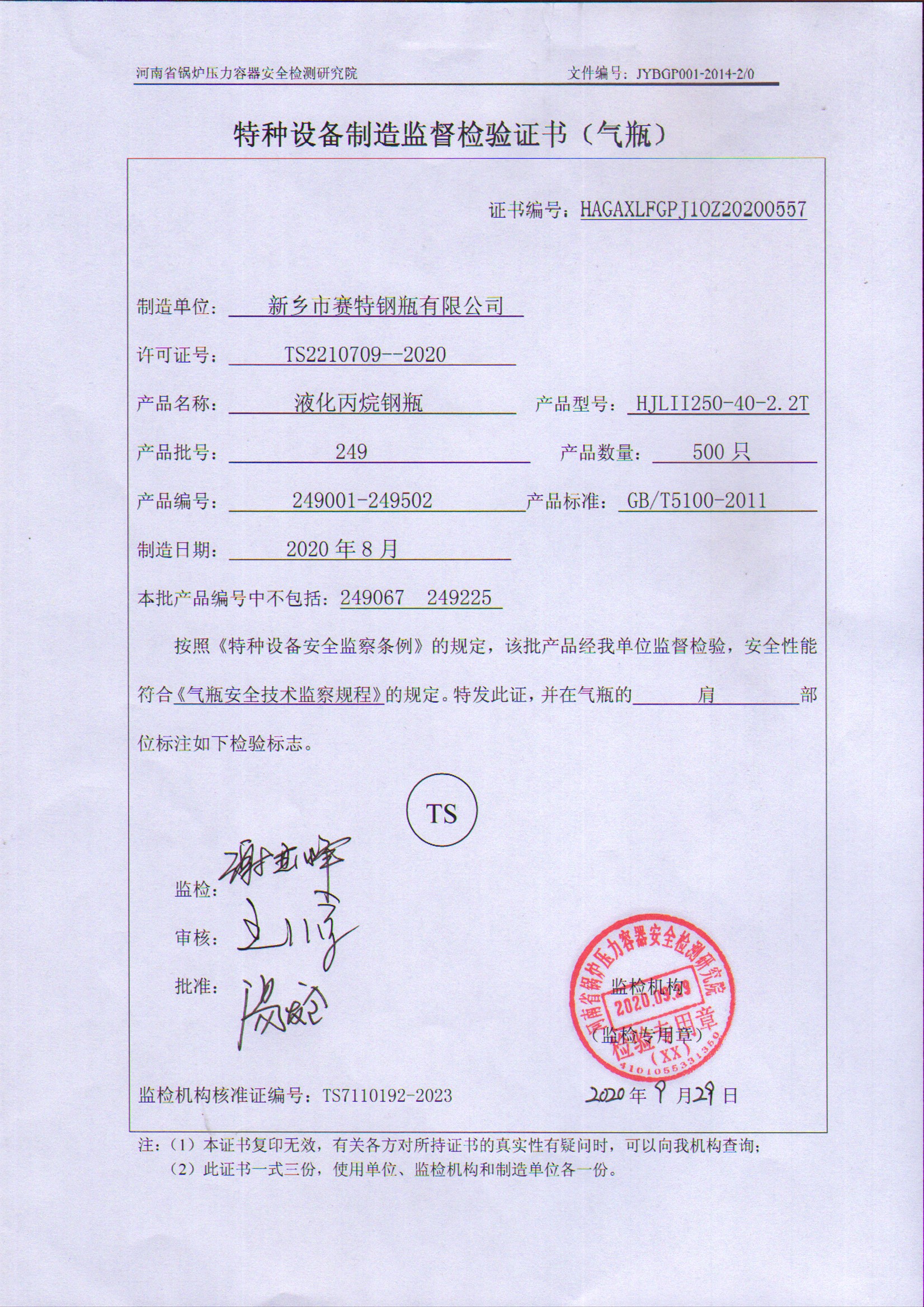 1.特種設(shè)備制造監(jiān)督檢驗(yàn)證書(shū)(氣瓶)